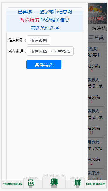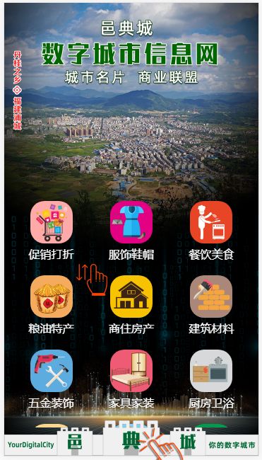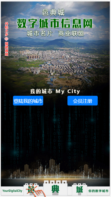 点击页面底部:“YourDigitalCity”“邑”“典”“城”“你的数字城市”,分别弹出对应页面,根据画面提示选择相关信息。