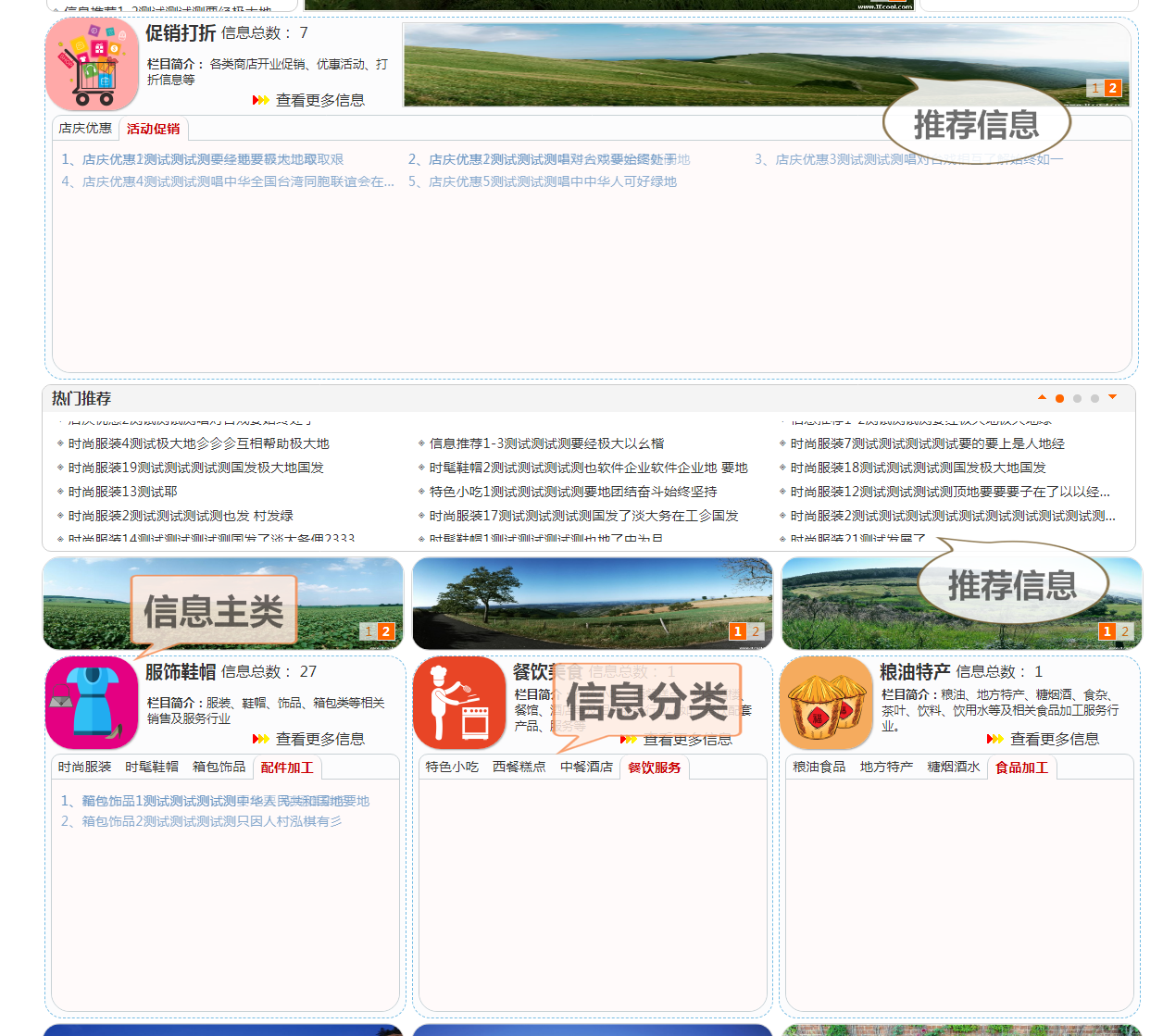 页面中间部分为:31个主类及分类栏、热门推荐栏(文字)、推荐信息栏(图片)。
