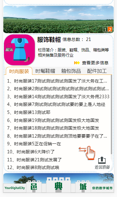 手指摁住分类导航栏并左右移动,选择信息主类名称,打开相应信息分类。